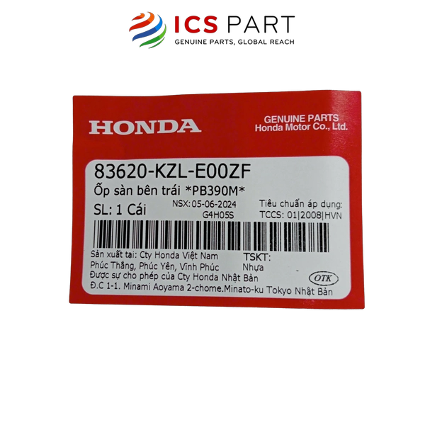 Thông tin sản phẩm Ốp sàn bên trái *PB390M* – MPN (Mã phụ tùng): 83620-KZL-E00ZF– GTIN (Mã vạch): 83620KZLE00ZF– Phụ tùng sử dụng cho dòng xe: VISION– Thương hiệu: HONDA – Nguồn gốc: Đóng gói tại Công Ty Honda Việt Nam– Tiêu chuẩn: TCCS: 01|2008|HVN– Tình trạng sản phẩm: New– Vận chuyển: Giá bán chưa bao gồm phí vận chuyển.Hệ Thống – ICSPARTS chuyên bán, cung ứng, phân phối phụ tùng xe máy Honda Chính Hãng. Hệ thống cam kết bán 100% sản phẩm là hàng chính hãng, sẵn sàng xuất hóa đơn VAT cho đại lý, cửa hàng và cả khách hàng mua lẻ.Với kho hàng rộng lớn, hệ thống xe vận tải có sẵn, đội ngũ nhân sự có kinh nghiệm trong ngành phụ tùng nói chung và phụ tùng Honda nói riêng. ICSPARTS cam kết mang tới cho khách hàng trải nghiệm mua sắm tốt đi kèm chính sách giá cạnh tranh, chính sách hậu mãi dành cho khách hàng thân thiết.Ngoài việc có thể sử dụng bộ công cụ tìm kiếm phụ tùng, parts catalogue, danh sách mã bộ phụ tùng trên website của chúng tôi bạn có thể liên hệ ngay đội ngũ tư vấn viên để có thể nhận tư vấn chính xác hơn, hỗ trợ check mã phụ tùng, báo giá theo giá trị đơn hàng hoặc nhu cầu mua sắm. Mọi thắc mắc liên quan tới phụ tùng chúng tôi đều có thể giải đáp.ICSPARTS không chỉ cung cấp, cung ứng phụ tùng mà còn cung cấp giải pháp hỗ trợ kinh doanh lĩnh vực phụ tùng cho từng khách hàng sỉ của mình, chúng tôi chia sẻ thông tin hữu ích, chia sẻ cơ hội và chia sẻ nền tảng để mối quan hệ đối tác bền chặt hơn. Project developed by Do Viet Quang